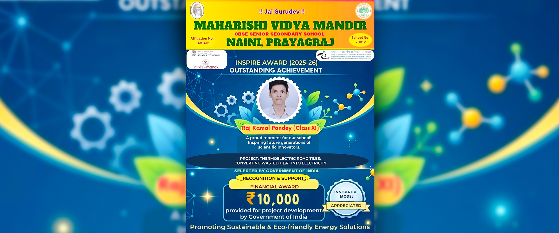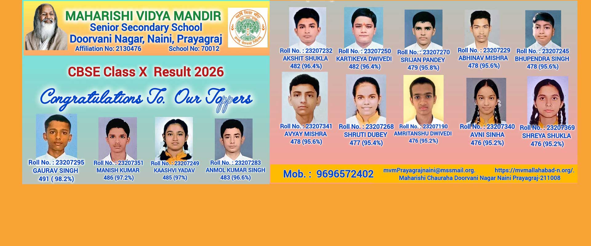 Maharishi Vidya Mandir, Prayagraj like all other Maharishi Institutions is established to introduce Maharishiji's Consciousness Based Education System in mainstream school education to its students. This system (MCBE) has been tried, implemented successfully and is repeatedly verified by over 700 scientific research studies conducted in 230 universities and independent research institutions of 35 countries.