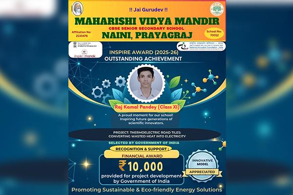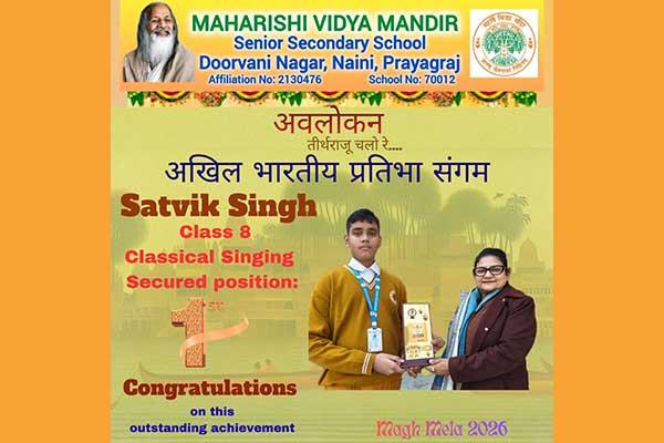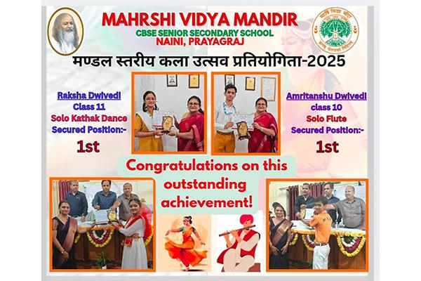 Vanshika Srivas of 9-C, MVM-Naini, clinched 2nd prize in the Uttar Pradesh Lok Natya Pratiyogita a folk dance competition with 17 schools, held at Prayag Sangeet Samiti, Prayagraj. Anuradha Shukla of Class 11B Commerce, Maharishi Vidya Mandir Naini, secured 1st prize at the Uttar Pradesh Lok Sanskriti Mahotsav, organized by the Ministry of Culture, Government of India.Arush Shukla of Class XI B earned 3rd position in a modelling competition.