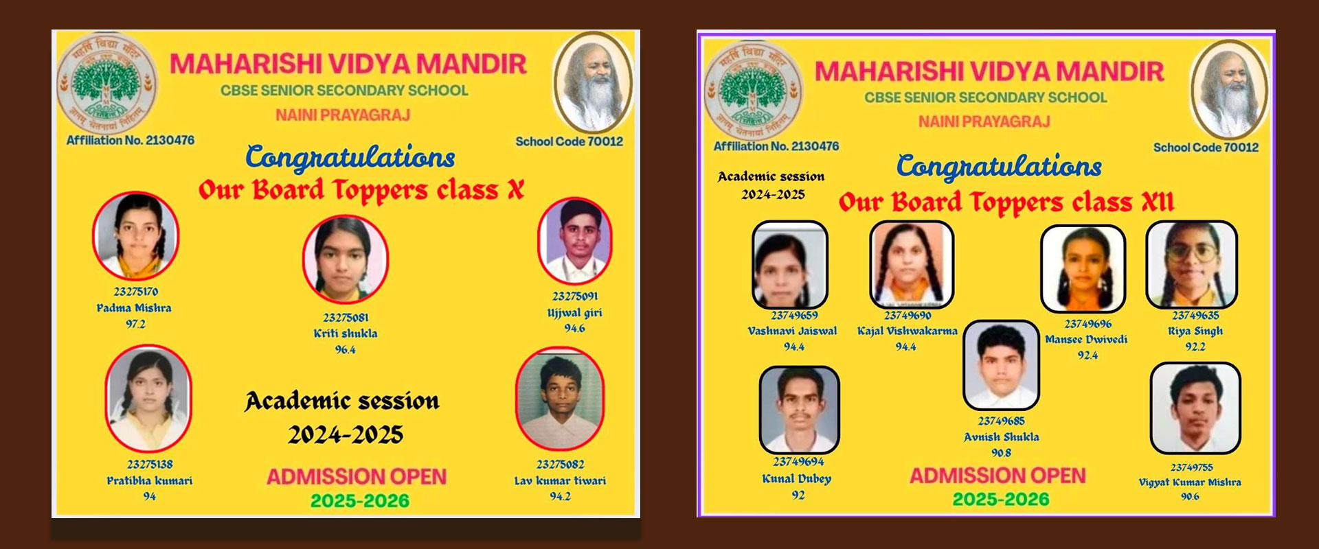 Maharishi Vidya Mandir, Prayagraj like all other Maharishi Institutions is established to introduce Maharishiji's Consciousness Based Education System in mainstream school education to its students. This system (MCBE) has been tried, implemented successfully and is repeatedly verified by over 700 scientific research studies conducted in 230 universities and independent research institutions of 35 countries.